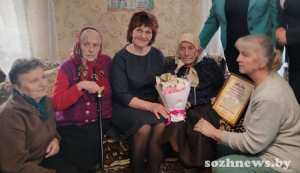 Поздравили именинницу представители организаций и общественных объединений района. Юбилейное свидетельство о рождении с присвоением почетного звания долгожителя вручила ей начальник отдела ЗАГС Гомельского райисполкома Елена Ритова, а новый паспорт — инспектор отдела гражданства и миграции УВД Гомельского райисполкома Полина Волотовская. Председатель Гомельской районной профсоюзной организации Белорусского профессионального союза работников АПК Ольга Замотевская вручила ей благодарность за плодотворную работу, высокий профессионализм и значимый вклад в развитие и укрепление сельского хозяйства района. Подарки и благодарность получила юбилярша из рук Галины Менделевой, председателя ветеранской организации района. Не обошли вниманием столетнюю жительницу Марковичей отдел культуры Гомельского района и Марковичский сельсовет, также преподнеся памятные подарки. А песня в исполнении молодых солисток районного дома культуры подняла всем настроение.
